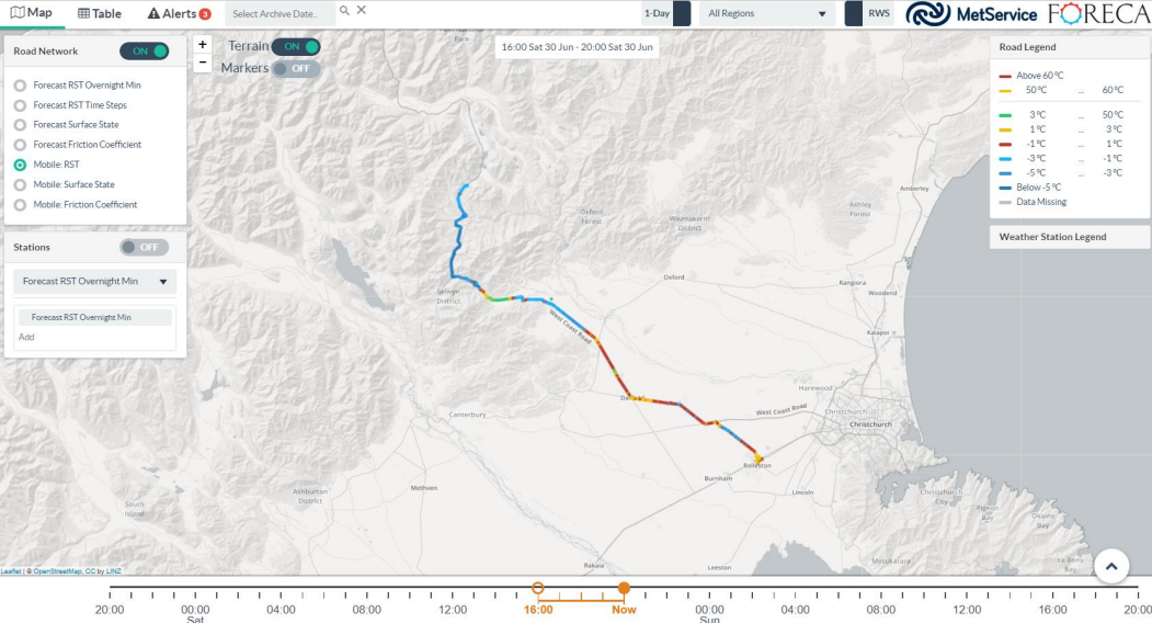 MetService’s Road Weather System is a powerful tool that delivers quality road weather information for the entire State Highway network. Users can view archived past data, real-time observations, and forecasts from a network-wide perspective, right down to a small section of road within a region.