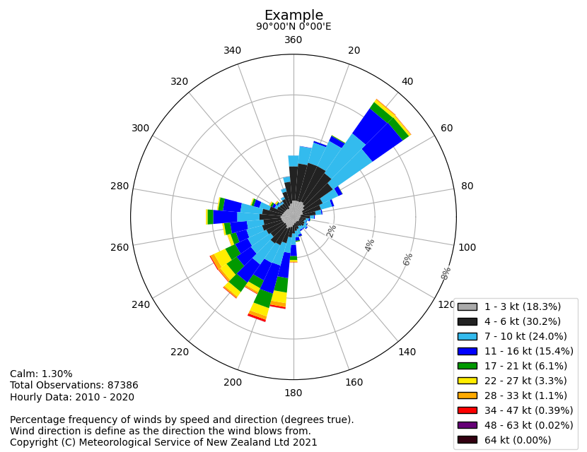 Wind rose - a representation the frequency of wind speed and direction for a given station. A single wind rose is $565+GST
