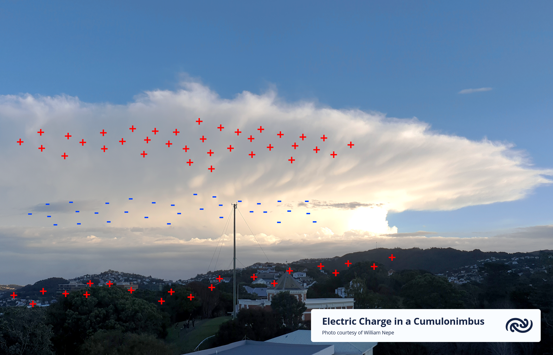 When these particles hit each other, electrons (tiny negative charges) are knocked off. The graupel, which is heavier, ends up with a negative charge and sinks toward the bottom of the cloud, while the lighter, positively charged ice crystals are carried upward by strong winds. This separation of negative and positive charges between the bottom and top of the cloud creates a powerful electric field within the cloud, like a battery. The spread of positive and negative charges is shown in the image below.